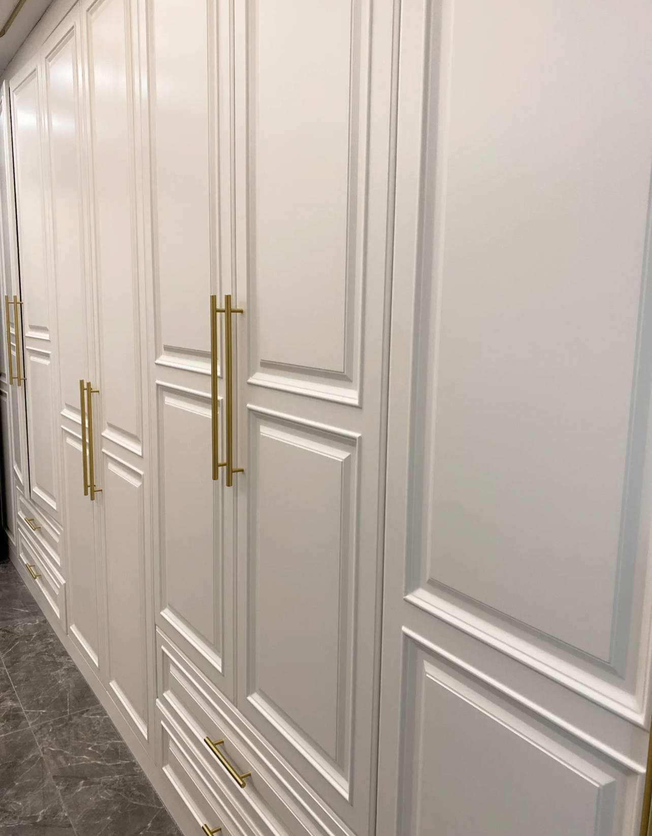 5、硬装用金色装饰条比如吊顶、墙面、衣柜门板等等,看着金碧辉煌的,其实,因为装饰条是胶粘上去的,有脱落风险,且打胶处容易变色,时间长了,发黑难清洁,属于不可持续的美。