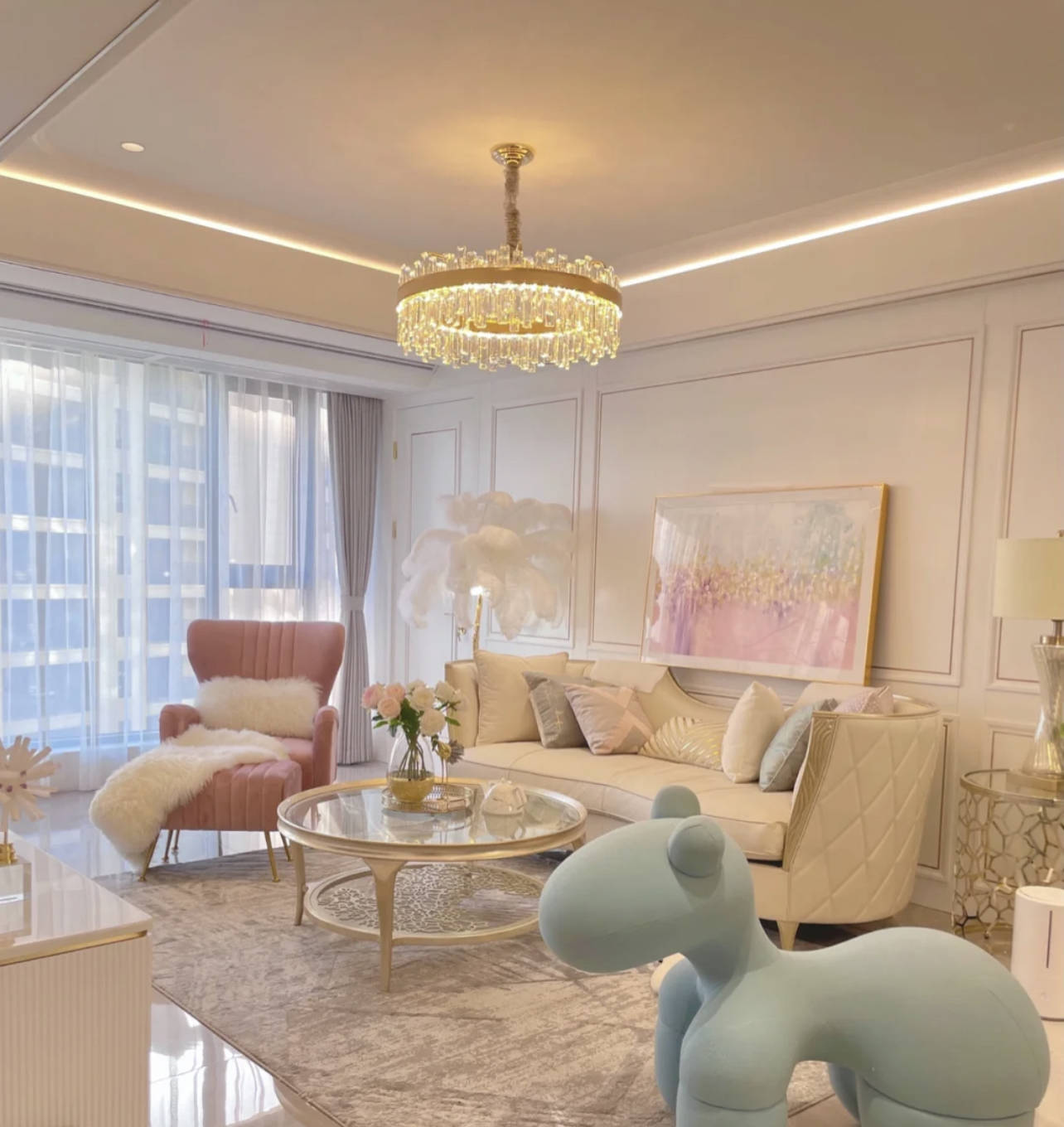 新住建议:实在喜欢这种水晶吊灯,建议选择造型稍微简单点的,客厅类似下图这种,仅周围一圈灯珠,反而简洁,轻奢感也不差。