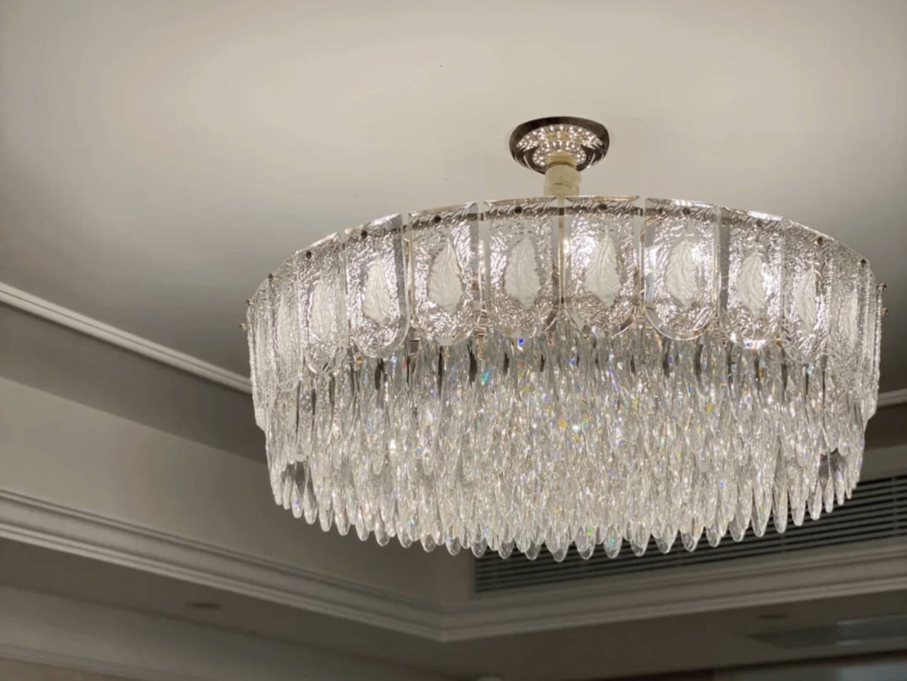 1、复杂水晶大吊灯可以说是轻奢风的代表,造型复杂,耀眼夺目,给人一种很“有钱”的样子。